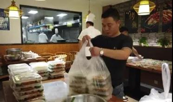 A restaurant in Ningbo's Fenghua district prepares free meals for more than 200 construction workers who have been relocated to emergency shelters on July 25. [Photo/WeChat account: nbfb0574]