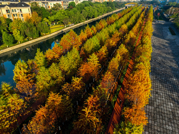 Colorful metasequoia leaves add a splash color to Xidahe Park in Zhenhai district, Ningbo, East China's Zhejiang province in the winter. [Photo/Ningbo Daily]