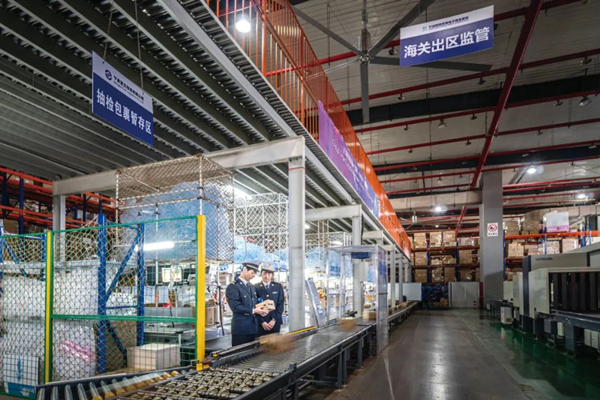 Customs officials examine parcels at a warehouse, located in Ningbo, East China's Zhejiang province. [Photo/WeChat account: nbfb0574]
